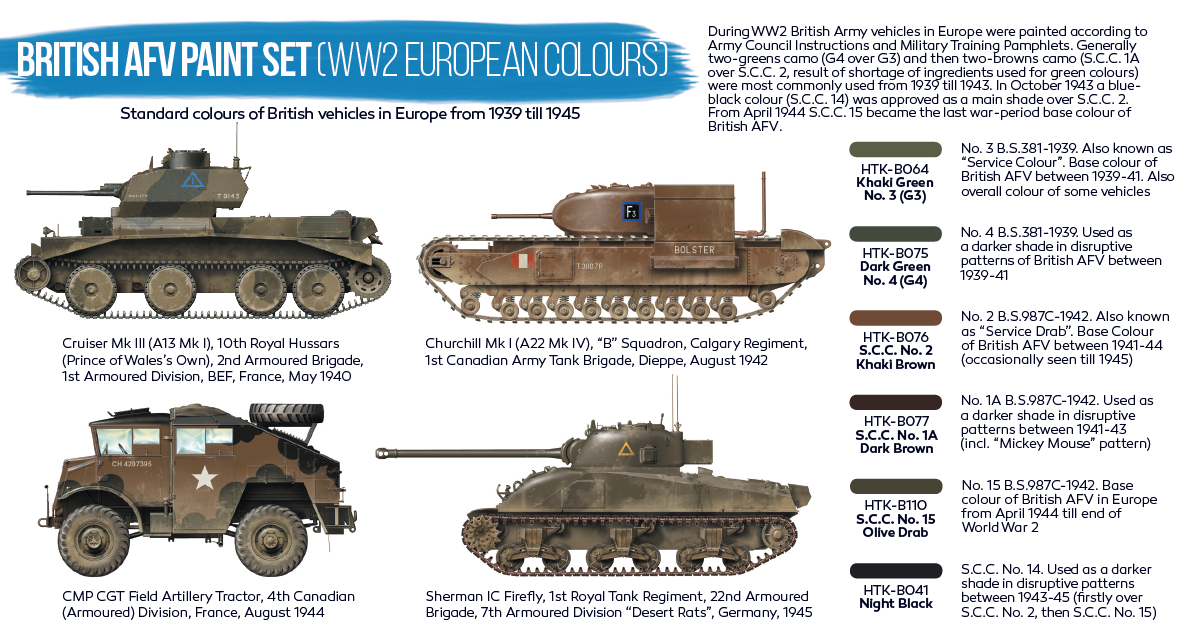During WW2 British Army vehicles in Europe were painted according to Army Council Instructions and Military Training Pamphlets. Generally two-greens camo (G4 over G3) and then two-browns camo (S.C.C. 1A over S.C.C. 2, result of shortage of ingredients used for green colours) were most commonly used from 1939 till 1943.