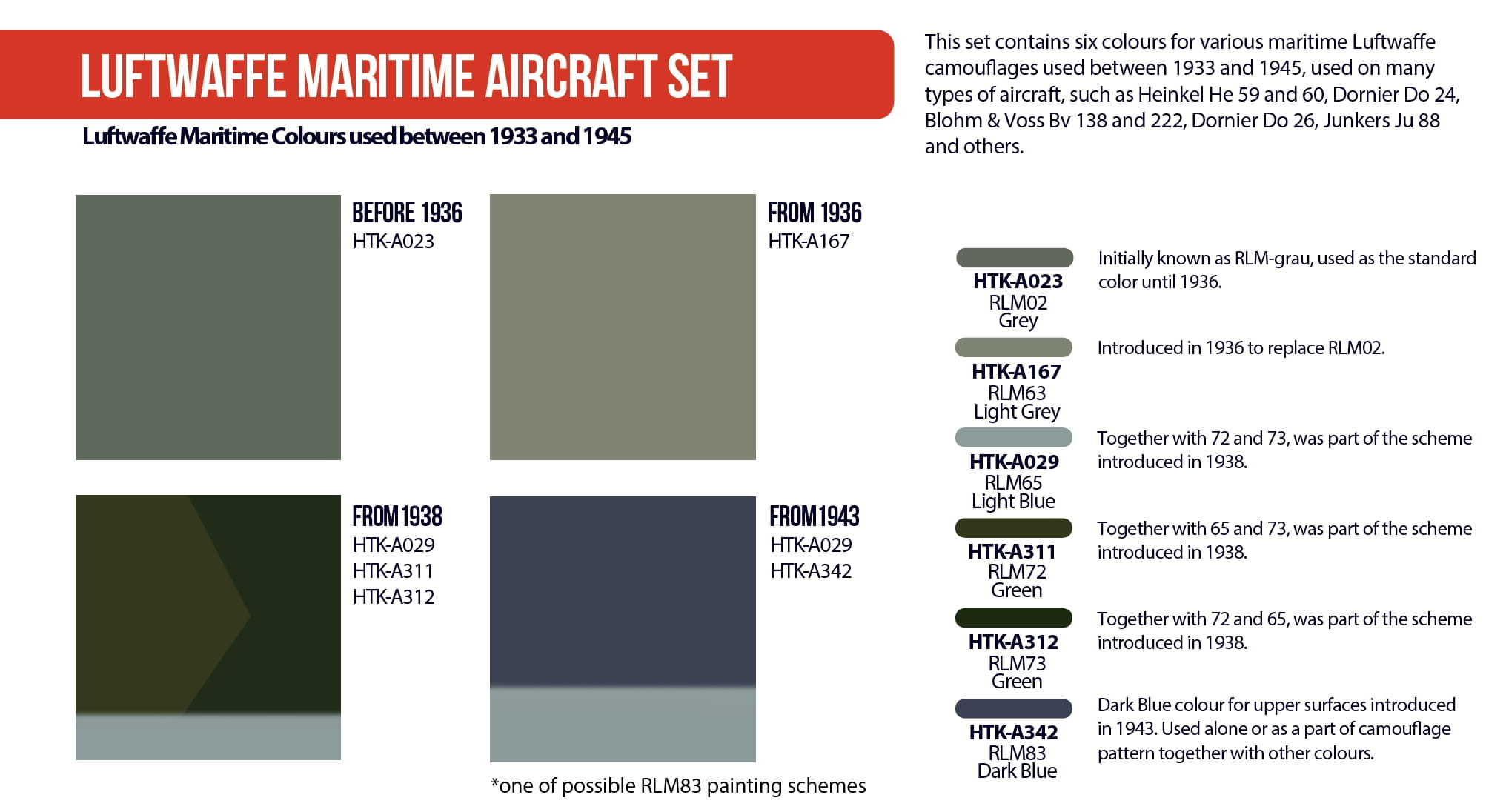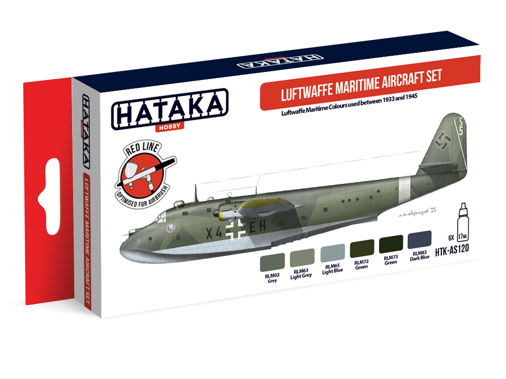This set contains six colours for various maritime Luftwaffe camouflages used between 1933 and 1945, used on many types of aircraft, such as Heinkel He 59 and 60, Dornier Do 24, Blohm & Voss Bv 138 and 222, Dornier Do 26, Junkers Ju 88 and others.